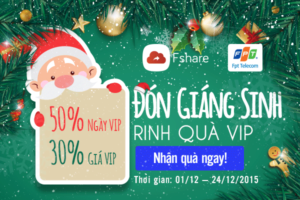 Rộn ràng chào đón Giáng sinh, trong thời gian từ 12h ngày 01/12 – 24/12, Fshare.vn tặng thêm 50% ngày, giảm 30% chi phí cho tất cả khách hàng nâng cấp VIP Fshare.