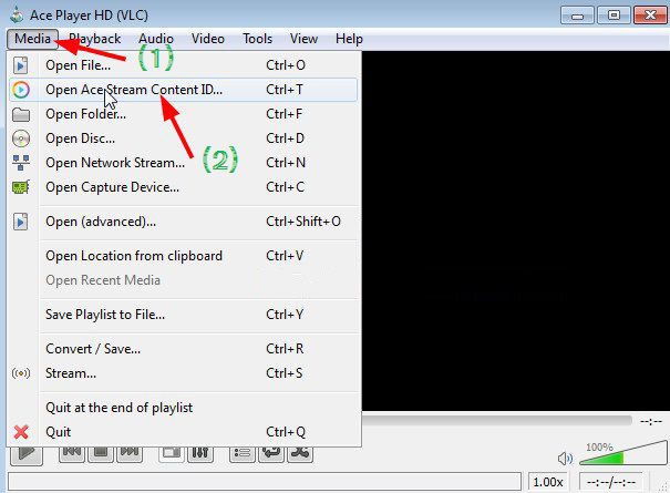 Mở phần mềm Ace Player HD ra > nhấn vào Media > chọn Open AceStream Content ID...