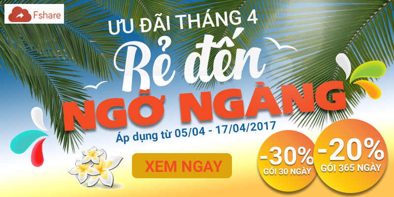 Từ 5/4 đến 17/4/2017, Fshare triển khai Chương trình Khuyến mãi tháng 04 với chủ đề “Ưu đãi tháng 04 – Rẻ đến ngỡ ngàng”. Theo đó, khách hàng khi mua các gói VIP 30 ngày và 365 ngày sẽ được nhận những ưu đãi vô cùng hấp dẫn từ Fshare.vn. Cụ thể như sau: