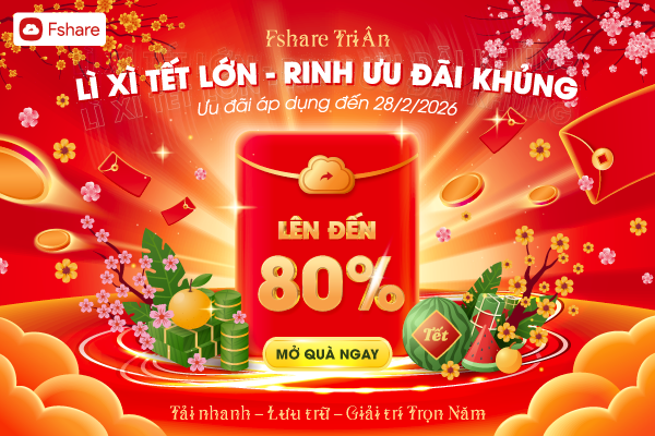 Nhân dịp Tết Nguyên Đán 2026, Fshare xin gửi lời cảm ơn chân thành đến Quý Đối tác là các Đại lý và Uploaders đã luôn đồng hành, đóng góp tích cực cho sự phát triển bền vững của dịch vụ. Những phần quà Tết tri ân sẽ được Fshare gửi trực tiếp đến Quý đối tác và Uploader trong dịp năm mới Nguyên Đán này.